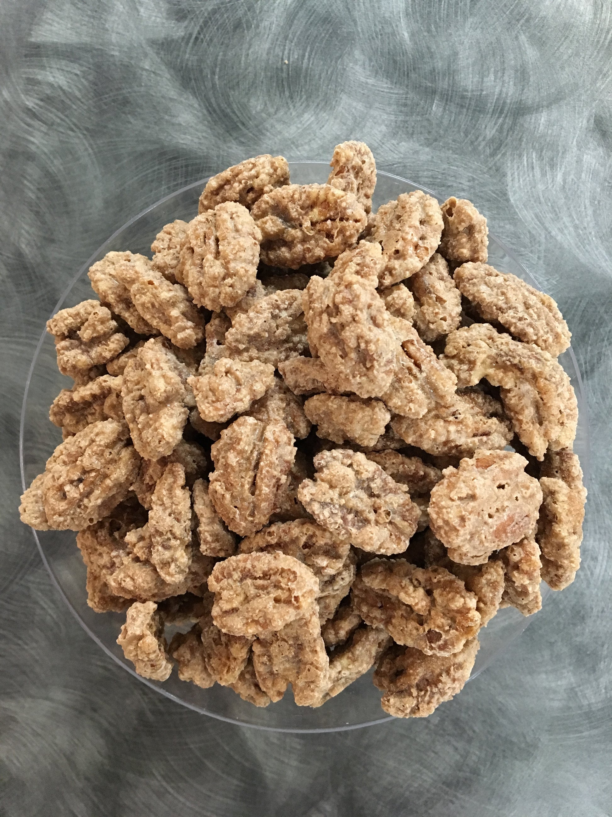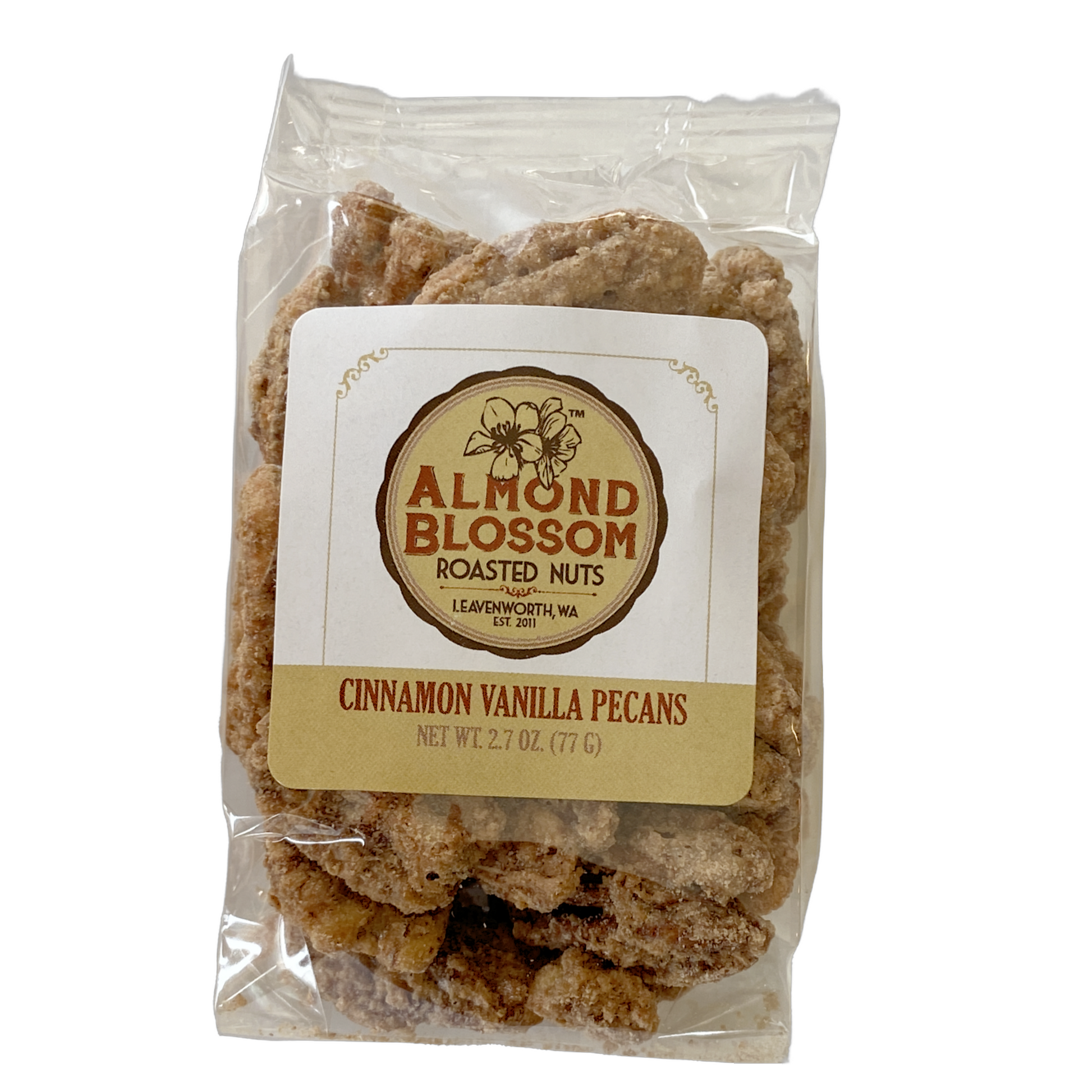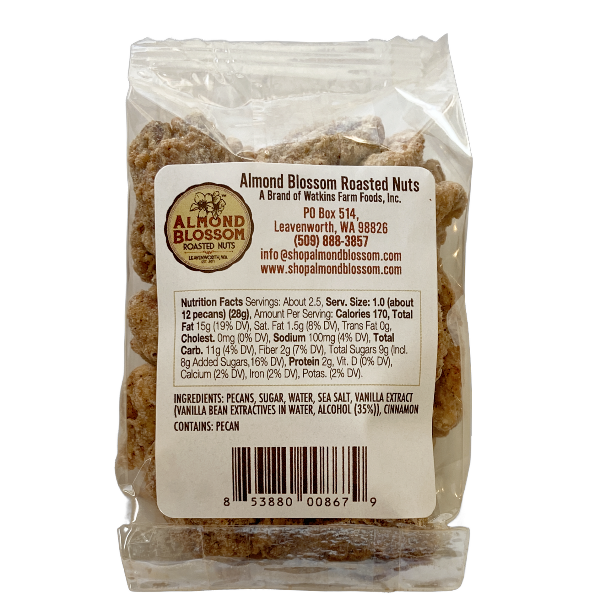 Premium size pecans lightly coated with pure cane sugar, real vanilla, a touch of cinnamon spice and finished with a sprinkling of sea salt.