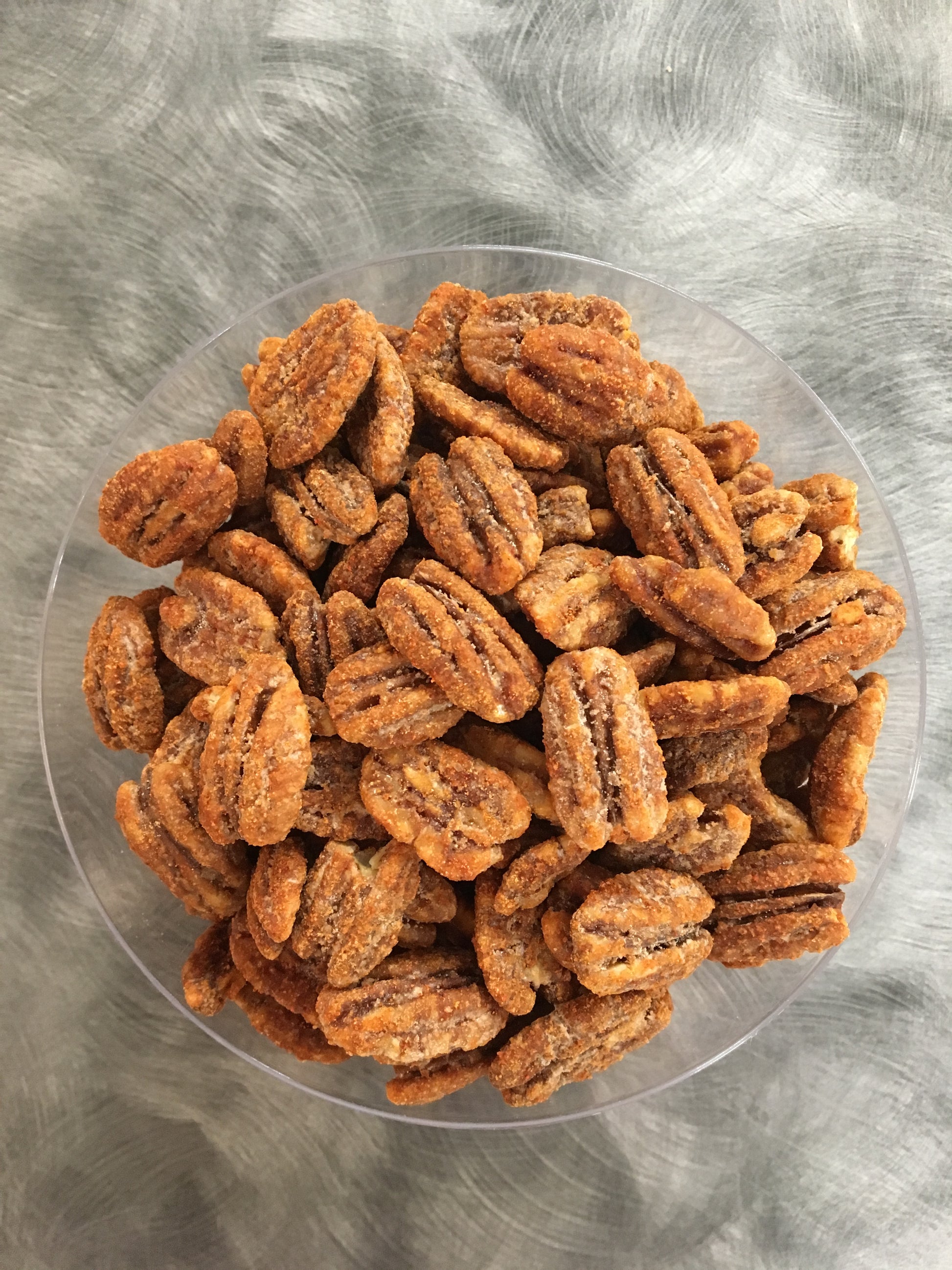 Premium size pecans lightly coated with pure cane sugar and maple syrup then dusted with chipotle and a sprinkling of sea salt.